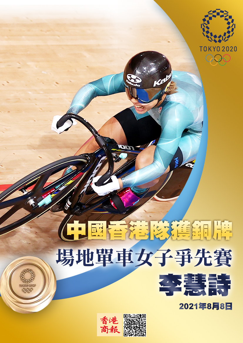 東京奧運場地單車女子爭先賽銅牌戰,港隊代表李慧詩以場數2比0擊敗德國選手艾瑪軒絲,勇奪銅牌。