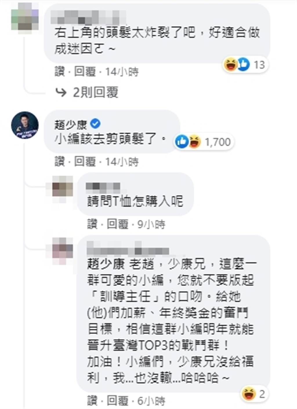 此文一出,獲得超過1400個讚、超過110則留言,迴響熱烈。其中一位小編因「炸裂」的髮型吸引網友眼球,有人留言:「右上角的頭髮太炸裂了吧,好適合做成迷因喔!」值得注意的是,這則留言也釣出趙少康的回覆:「小編該去剪頭髮了。」而趙親回的這則留言,截至發稿時間更獲得1700個讚。
