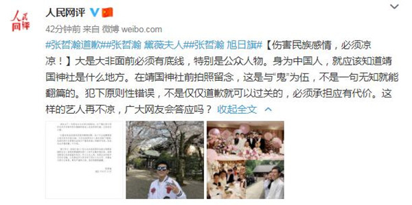 人民網評則說,「身為中國人,就應該知道靖國神社是什麼地方。在靖國神社前拍照留念,這是『與鬼為伍』,不是一句無知就能翻篇的。犯下原則性錯誤,不是僅僅道歉就可以過關的,必須承擔應有代價。這樣的藝人再不涼,廣大網友會答應嗎」?