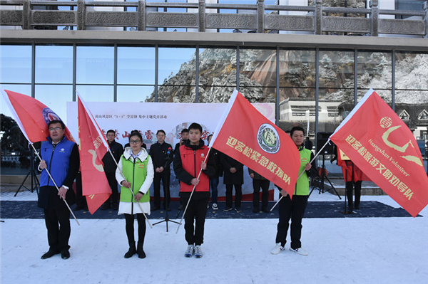 為迎客松緊急救援隊、迎客松旅遊文明勸導隊、迎客松生態文明宣傳隊、迎客松義警隊4只志願者隊伍授旗 張鵬攝