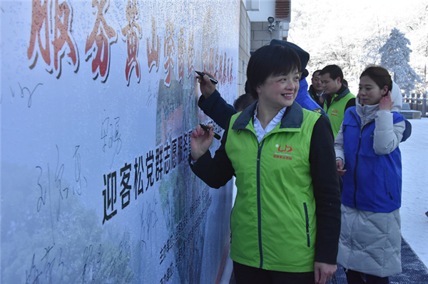 揭牌儀式後,綜合執法局、規土處、園林局、公安局領導分別為迎客松緊急救援隊、迎客松旅遊文明勸導隊、迎客松生態文明宣傳隊、迎客松義警隊4只志願者隊伍授旗。全體志願者在黃山之巔莊嚴宣誓,誦讀黃山松精神,並在活動背景板上簽上屬於自己的承諾,引發了志願者們的強烈反響。