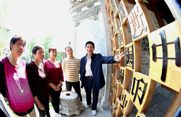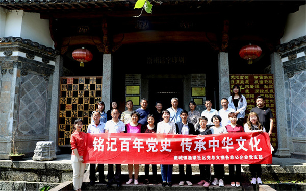 5月10日,安徽黃山市歙縣徽城鎮漁梁社區舉辦“銘記百年黨史,傳承中華文化”主題黨日活動,當地老鄉賢姚邦根(右一)紹介“徽州活字印刷”的歷史背景。