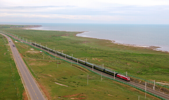 世界屋脊駛來速度最快的“中國紅”火車頭,火車疾馳在青海湖邊
