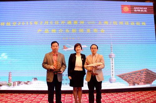 吉祥航空商务部副总经理孙培兰(中)分别向惠州市旅游局、惠州机场管理公司致送纪念品。