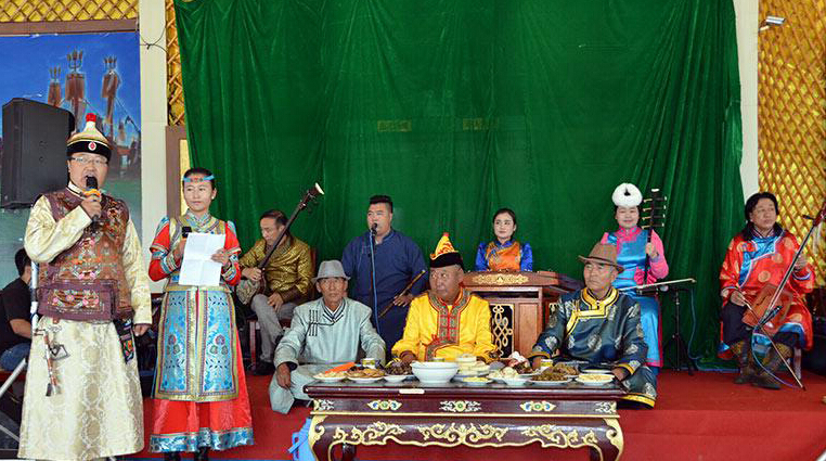 首先,由祝頌人高高舉起十個蒙古棗餅走到尊貴的主賓前,把蒙古棗餅敬獻給主賓,稟報金牛宴席準備情況,主賓贊同并宣布舉行金牛宴儀式。