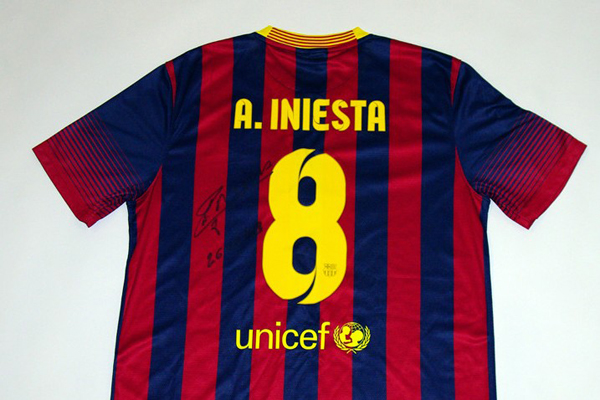 北京時間2013年10月27日,新賽季西班牙“德比”中,巴塞羅那2比1戰勝了皇家馬德裏,伊涅斯塔助攻內馬爾打進了巴薩第一球。而就在這場備受世界球迷關注的比賽鳴哨前,伊涅斯塔鄭重地在一件巴塞羅那球衣上簽下了自己的名字——Andres Iniesta(8) ,並特意注明了“2013.10.26”這一日期,並囑咐體壇周報記者帶回中國進行慈善拍賣,善款全部捐給海南瓊中女足。