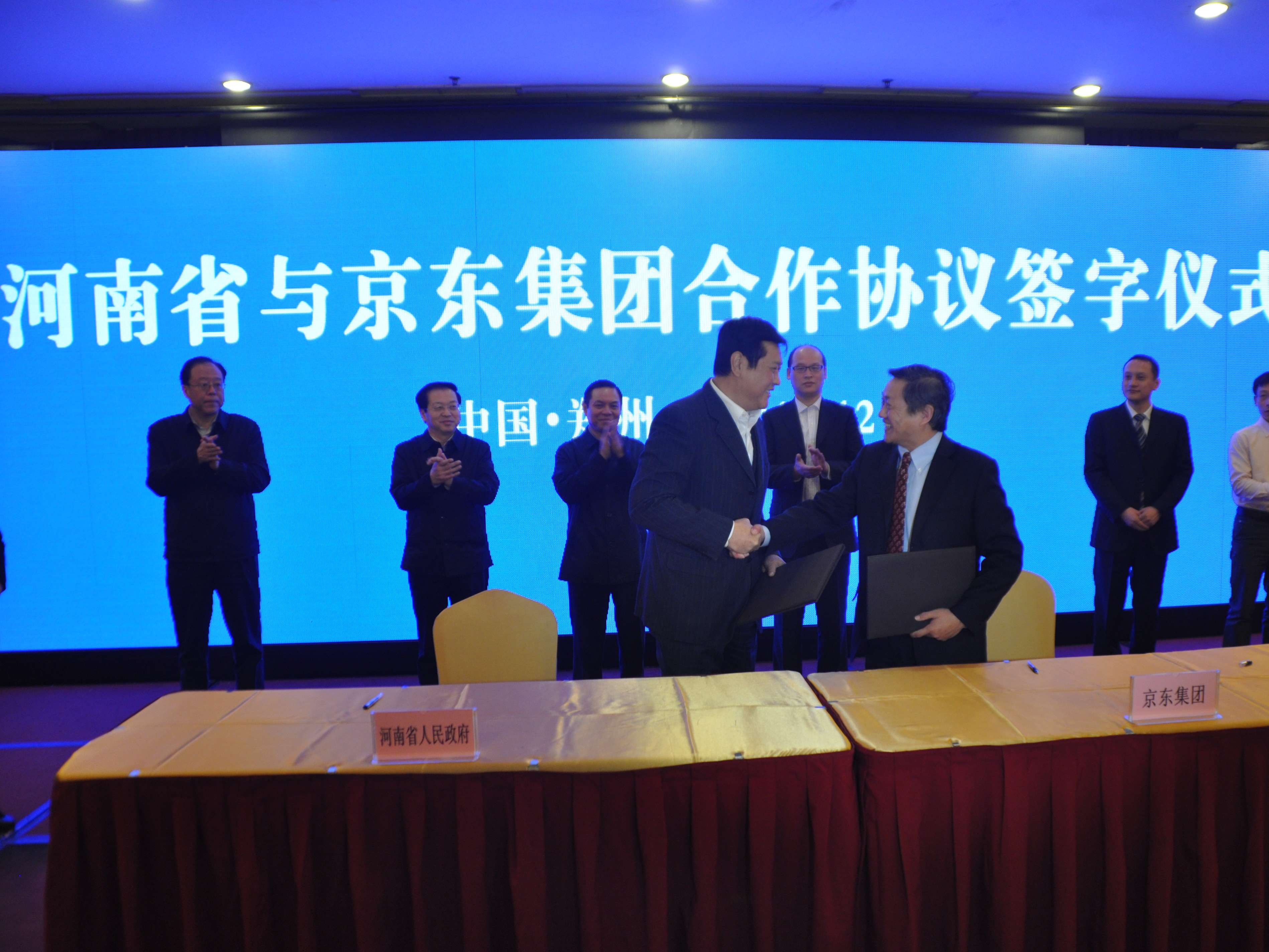 河南省副省长赵建才与京东集团高级副总裁马健荣签署《河南省人民政府与北京京东世纪贸易有限公司战略合作协议》