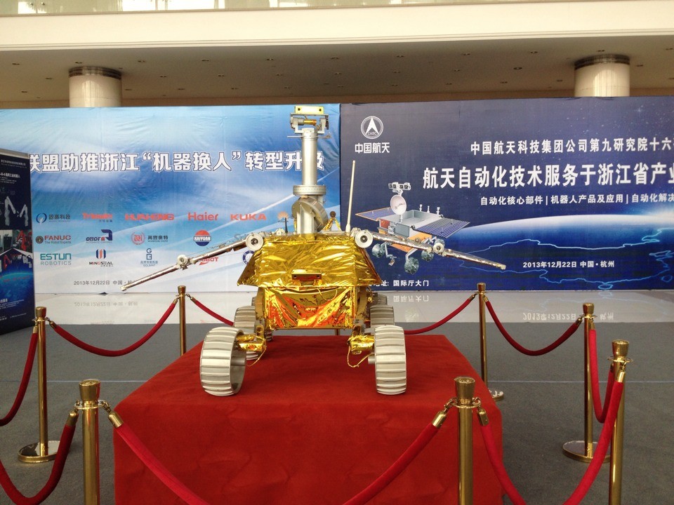 值得一提的是,成功登月的“玉兔號”月球車也在機器人展上閃亮登場。“這是自‘玉兔’成功登月之後首次在公眾場合亮相”,前來參加此次全球機器人展的中國航天科技集團代表告訴記者,“‘玉兔’本身就是一個智能機器人,它代表著中國機器人制造的最尖端先進技術集成。如何把航天科技和機器人制造的成果應用到其他領域、轉化為其他高科技產品,轉化為生產力,助推浙江民營企業產業升級,這也是我們此行帶‘玉兔’來浙江的主要目的。”