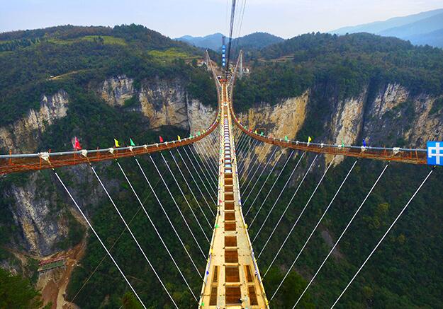 建成后的張家界大峽谷玻璃橋總長達430米、寬6米,橋面距離谷底相對高度約300米,采用全透明玻璃鋪設,并將創下世界最長玻璃橋面人行橋,世界首座大張開量空間索面懸索橋,世界首座玻璃作為主要受力結構的大型橋梁,世界最陡溜索,橋面上建有世界最高蹦極臺等十項世界之最。
