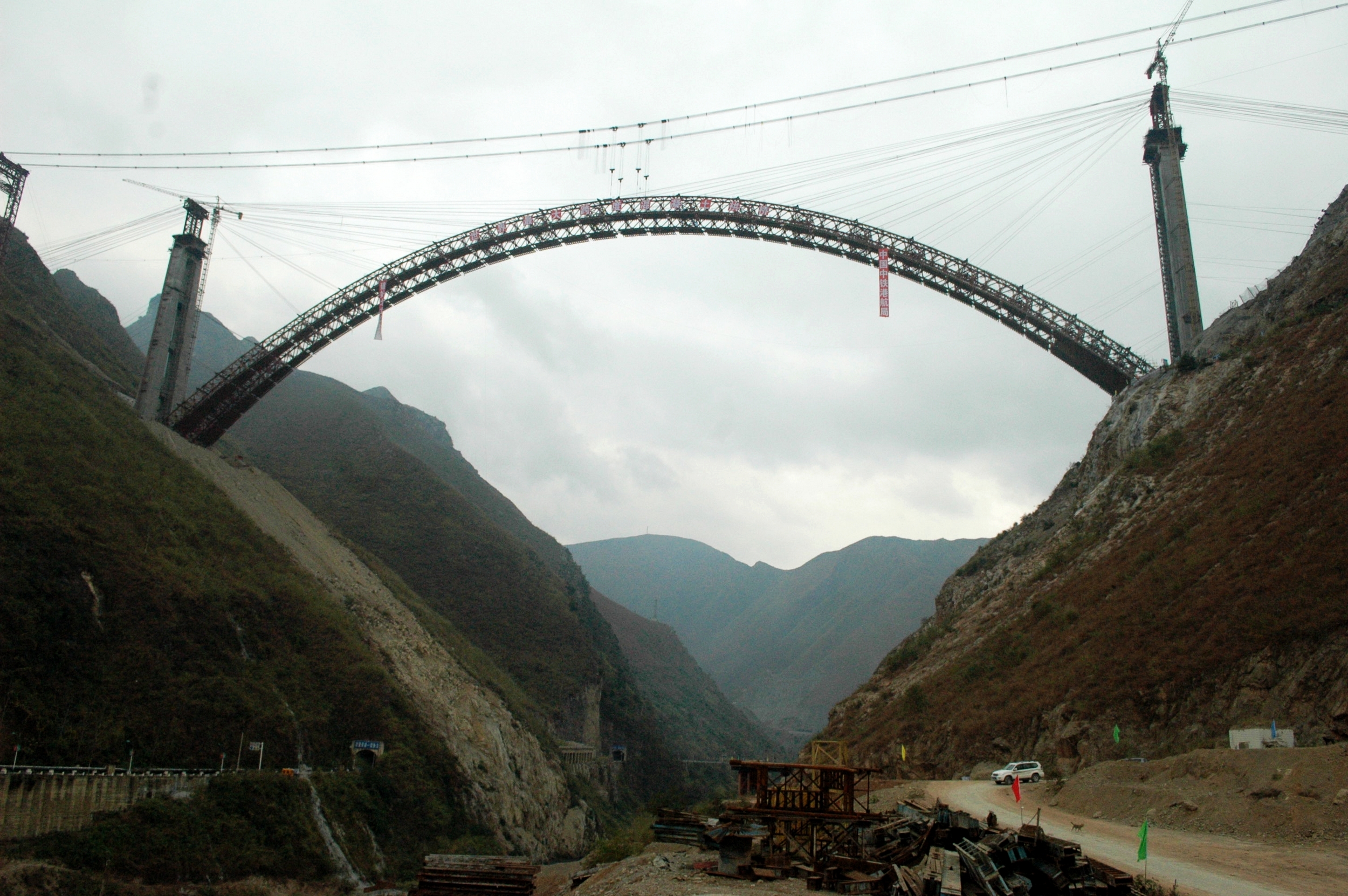 据了解,沪昆高铁是国家“五纵五横”铁路通道之一,全线长2264公里。沪昆铁路客运专线北盘江特大桥是沪昆客专控制性工程之一,融汇了中国桥梁建设中拱桥、斜拉桥、连续梁桥等桥型的特点。大桥在北盘江上横跨贵州省关岭与晴隆两县,预算投资4.5亿元,2010年10月开工建设,建设工期52个月,预计2015年2月建成。