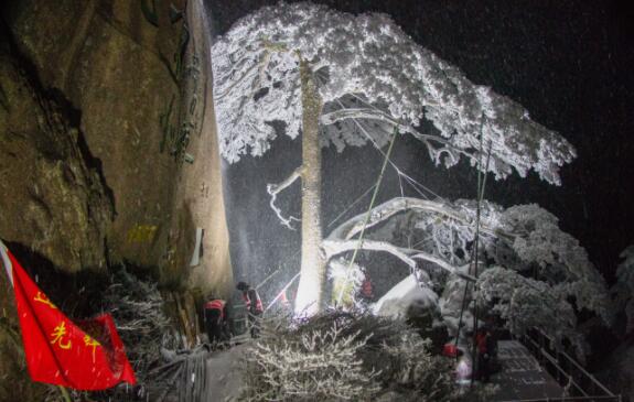 為確保國寶迎客松安全,12月8日晚上11點10分至12月9日凌晨3時35分,景區古樹名木保護應急小分隊一行10人頂風冒雪,對迎客松冠頂關鍵點位共增加7根支撐桿件,并安排人員輪流全時段值班值守,實時動態觀測。