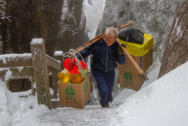 挑山工們冒著淹沒腳踝的積雪,一步一搖一晃,艱難地挑運食品等物資和床單上山,保障山上游客和員工生活需要。