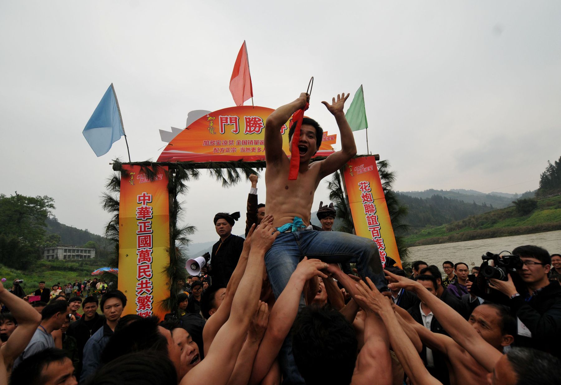 4月22日,在广西三江侗族自治县富禄乡第130届花炮节上,“抢花炮”运动员在庆祝获胜。(吴练勋 摄)