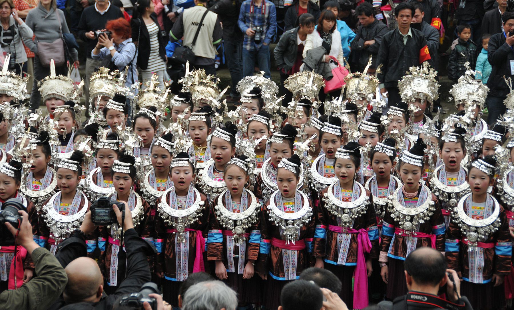 4月2日,在广西三江侗族自治县富禄乡第130届花炮节上,侗族姑娘在唱侗族大歌。(吴练勋 摄)