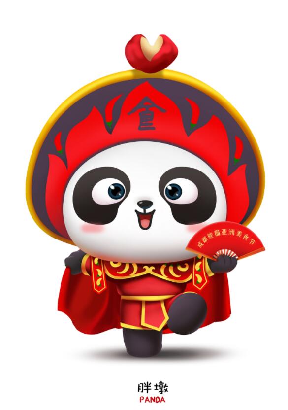 吉祥物則以大熊貓作為基礎原形展開設計,將製作川菜必備的辣椒、花椒等元素融入具有代表性的川劇變臉服飾中,運用紅色和黃色兩個顏色作為主色調,明亮活潑,並以PANDA的音譯胖墩命名,既有作為吉祥物的呆萌可愛,同時多方面展現了四川特色文化。此次吉祥物的設計從視覺表現和內涵傳達上充分展現了此次「成都熊貓亞洲美食節」活動的現代感和民族感。