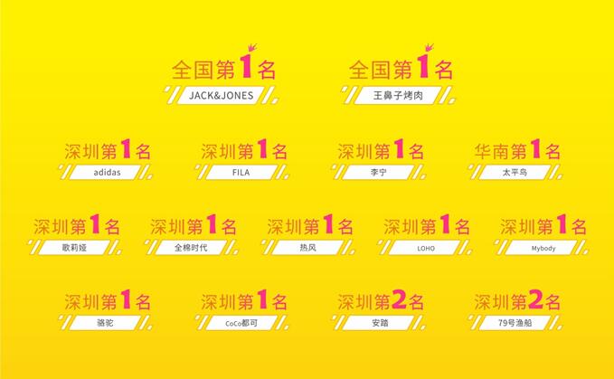 開業期間,壹方天地B區與已開業的A區、E區聯動,舉辦了一系列活動,獲得開業活動三天客流量突破69.3萬人次,銷售額超5000萬的佳績。開業期間,品牌商戶的經營業績也極為亮眼、NIKE、WESTLINK、YISHION、SANFU、79號漁船等多個品牌銷售額位居深圳乃至全國前列。其中,adidas、FILA、李寧、太平鳥、歌莉婭、全棉時代、熱風等品牌勇奪深圳第一,JACK&JONES和王鼻子烤肉更是獲得全國第一的好成績。