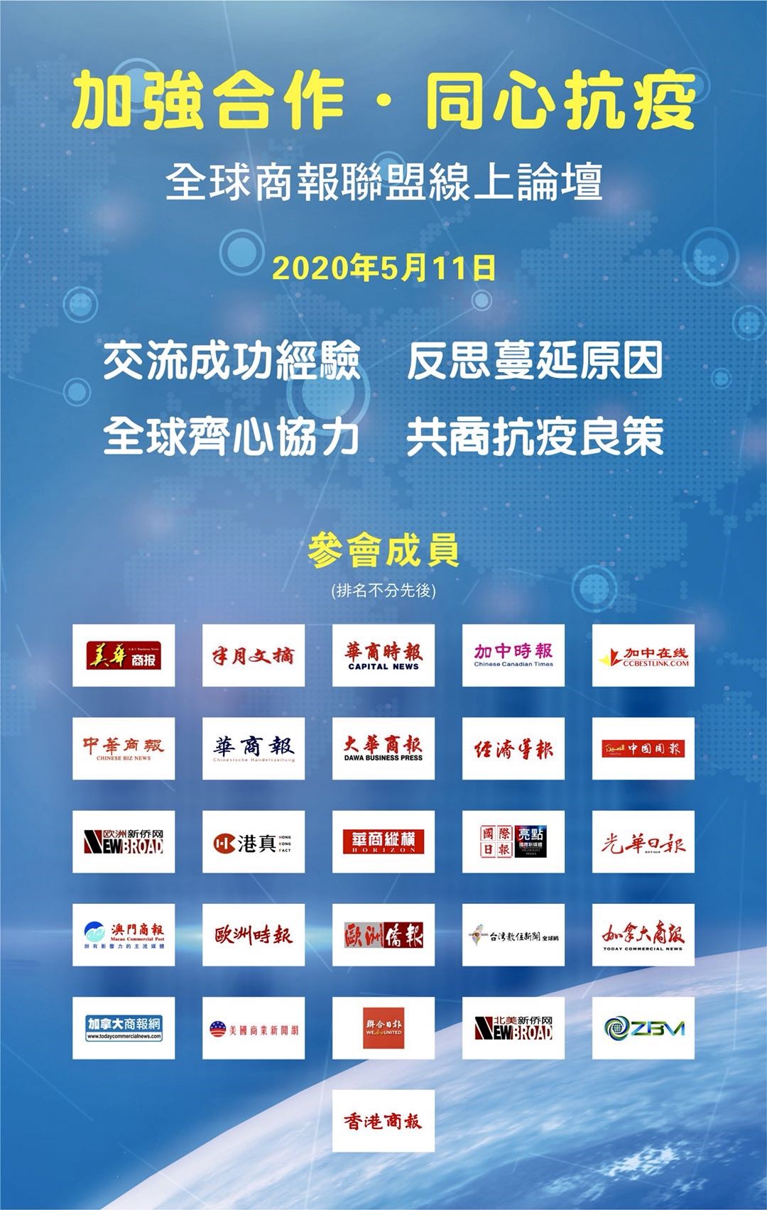 (东盟华商在线报道: ) 由全球商报联盟首次主办的“加强合作・同心抗疫”在线论坛5月11日晚闪亮登场,来自北美洲、欧洲、亚洲、非洲及港澳台14个国家和地区的24家主流华文媒体代表,克服巨大的时差障碍,相聚网络空间,分享所在国家和地区的抗疫经验和做法,高度肯定中国政府和民间在这次抗疫中的表现,坚决反对将疫情污名化、政治化,呼吁世界各国加强合作,共商抗疫良策。