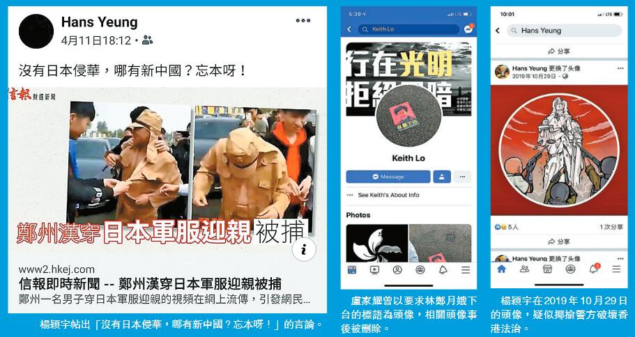 根據網上流出的資料顯示,楊穎宇的社交平台自2010年起,充斥對特區政府的不滿、仇中、違背《基本法》及仇警等言論,包括帖出「沒有日本侵華,哪有新中國?忘本呀!」的言論,以回應去年4月內地一則有關鄭州漢穿日本軍服迎親被捕的報道;讚好另一位任教歷史科老師責罵內地政治的言論,錯誤形容特區政府授勳是「統戰」香港的工具;發表「民主未必已死,已死的是基本法」、揚言不為基本法加上書名號,是因它不再是一部具權威的法律文件等帖文,相關帖文明顯違背了《基本法》。
