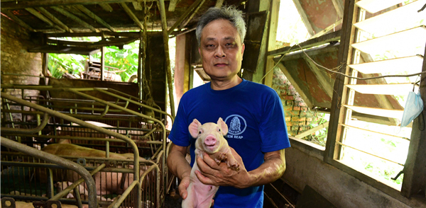 侯立輝 (左) 與尹鏡新視察受影響葬區的山墳,侯指在馬鞍山(遠方山巒)腳下的葬區是風水地,搬遷祖墳影響村落風水。