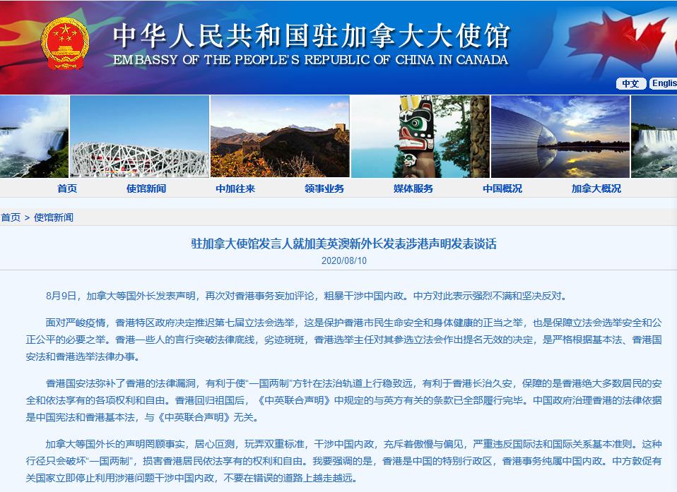 【香港商報網訊】8月10日,據中國駐加拿大大使館網站消息,駐加拿大使館发言人就加美英澳新外長发表涉港聲明发表談話,對于8月9日,加拿大等國外長发表聲明,再次對香港事務妄加評論,粗暴干涉中國內政的行為,中方對此表示強烈不滿和堅決反對。