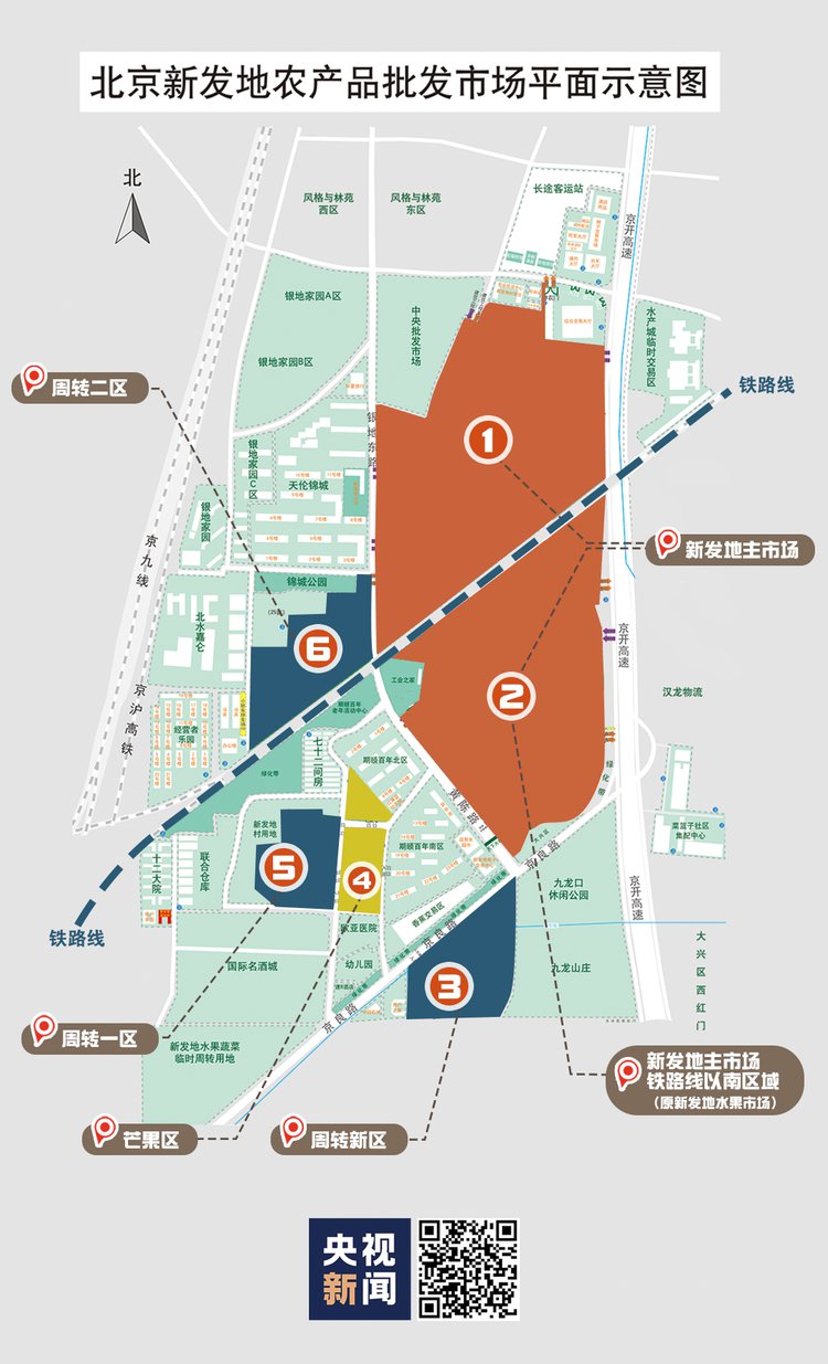 新发地批发市場包括1485畝的主市場,一條鐵路線從中間橫穿。還有主市場西側和西南邊的4個果蔬批发經營區,由南向北分別是:周轉新區、芒果區、周轉一區和周轉二區,面積為421畝。