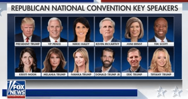 值得注意的是,不同於以往總統候選人只在最後一晚發言,謀求連任的美國總統特朗普在共和黨大會上每晚都將發言。與此同時,在大會上發言的除了共和黨內的部分重量級政客,特朗普家族成員也將“組團”登場,美媒指出,在本屆大會的重要演講者中竟有一半的人姓特朗普,而前總統小布什、前眾議院議長瑞安與前國務卿鮑威爾等共和黨大佬卻悉數缺席。