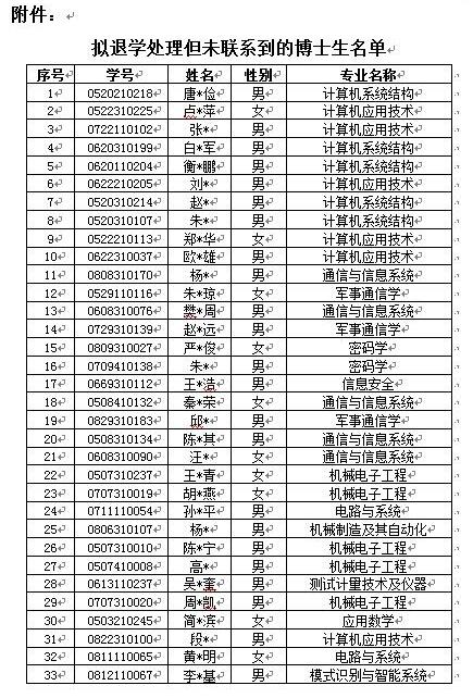 公示稱,根據教育部《普通高等學校學生管理規定》第三十條和《西安電子科技大學研究生學籍管理實施細則》第二十六條有關規定,西安電子科技大學擬對超過最長學習年限的博士研究生作退學處理。本次擬退學人員中,有33人聯系不到,校方將名單予以公示,公示期為2020年8月21日—2020年9月1日。