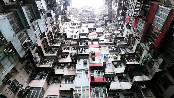 大廈建於七十年代,住有約二千多戶居民,地面一層是商舖。密密麻麻、參差不齊、凹凹凸凸、亂中有序,置身其中有壓迫得透不過氣的感覺,像被怪獸吞噬,抬頭望上去,十分震撼。