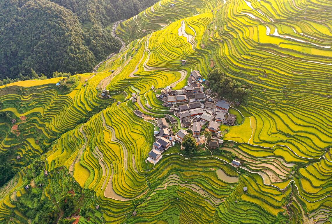 秋日时节,位于贵州省黔东南苗族侗族自治州从江县的加榜梯田,犹如一幅幅色彩斑斓的油画,吸引了众多游客前来观光游览。加榜梯田依山而开,随山势地形的变化呈现出不同的秀丽线条。梯田间的山村、小寨与其交相辉映,和大自然融为一体,体现出人类与大自然的和谐之美。(图源:新华社)