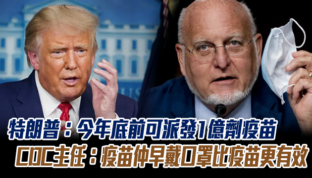 美國總統特朗普於香港時間17日預估今年底前就可派发至少1億劑2019冠狀病毒疾病疫苗,這番言論與美國疾病管制暨預防中心(CDC)主任羅伯特·雷德菲爾德稍早发言相悖,特朗普說這名官員「搞糊塗了」。