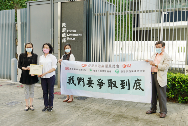 工聯會屬會香港旅遊業僱員總會23日到政府總部請願,向商務及經濟發展局遞交請願信,要求當局放寬防疫抗疫基金對旅遊業界的審批和提供資助,包括重新覆核、審視前兩輪基金被拒的個案及從業員的資格,向導遊、領隊發放每人5000元一次性資助及5000元進修津貼等。此外,香港旅行社東主協會則聯同多個政黨,與食物及衛生局局長陳肇始會面,促請當局早日實施「香港健康碼」,恢復跨境旅遊。