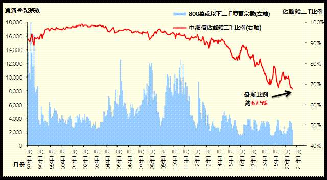 綜合土地註冊處最新資料,今年年八月份全港共錄2341宗價值800萬元或以下的二手住宅買賣登記,佔同期整體二手住宅買賣登記(3470宗)比例約67.5%,除較七月份約68.2%再跌0.7個百分點外,更連月創下1996年有紀錄以來的歷史新低。自去年十月中施政報告放寬按保樓價上限後,入市中高價物業的比例逐漸增加,導致800萬元或以下的住宅買賣佔比由去年十月的75.8%輾轉跌至今年八月的67.5%,10個月之間累跌了8.3個百分點,預期有關跌勢仍將持續。(圖源利嘉閣)