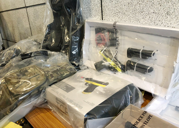 警方國家安全處高級警司李桂華25日表示,新界北重案組人員24日在粉嶺欣盛苑拘捕49歲女子和其23歲兒子,搜出1支胡椒球槍、1支伸縮棍、2把軍刀、3支氣槍、1件避彈衣及15個軍用級防毒面罩,涉嫌無牌管有槍械及彈藥和未經許可入口戰略物資罪名。初步調查得悉,有人透過海外網站購入該批物品,以集運形式運到本港,然後在網上發售。