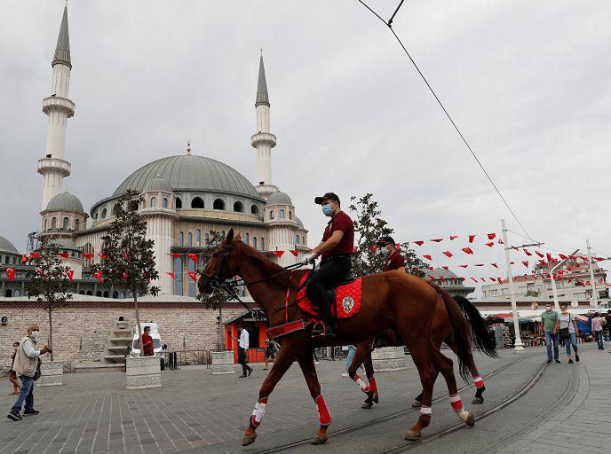 2020年9月26日,在土耳其的伊斯坦布爾,為了防止新冠病毒的傳播,騎警在塔克西姆廣場等地對沒有戴防護口罩的市民進行監察和勸告。伊斯坦布爾是一個同時跨越歐、亞兩大洲的名城,作為歐洲古代三大帝國──羅馬帝國、拜佔庭帝國以及奧斯曼帝國首都的伊斯坦布爾,保留了輝煌的歷史遺產,1985年被聯合國教科文組織列為世界文化遺產。 (圖源:路透社)