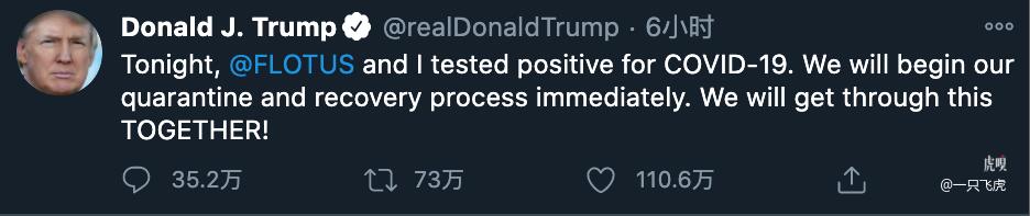 美媒Axios報道,特朗普當地時間10月2日淩晨发布的確診新冠推文,成為他迄今為止轉載和點贊最高的一條。當時发布時間是淩晨0:54分,許多美國人都已經睡覺了,這條推文依然很快創下記錄。目前該推文已被點贊超過110萬次,轉发超過73萬次,評論超過35萬,而且還在繼續上漲。