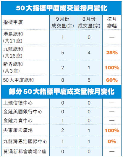 總計今年首9個月,指標甲廈合共僅錄得52宗買賣,按年急跌約54%,與商廈市道暢旺時,例如2017年3月單月錄得53宗相比,更顯出今年以來甲廈交投十分淡靜。