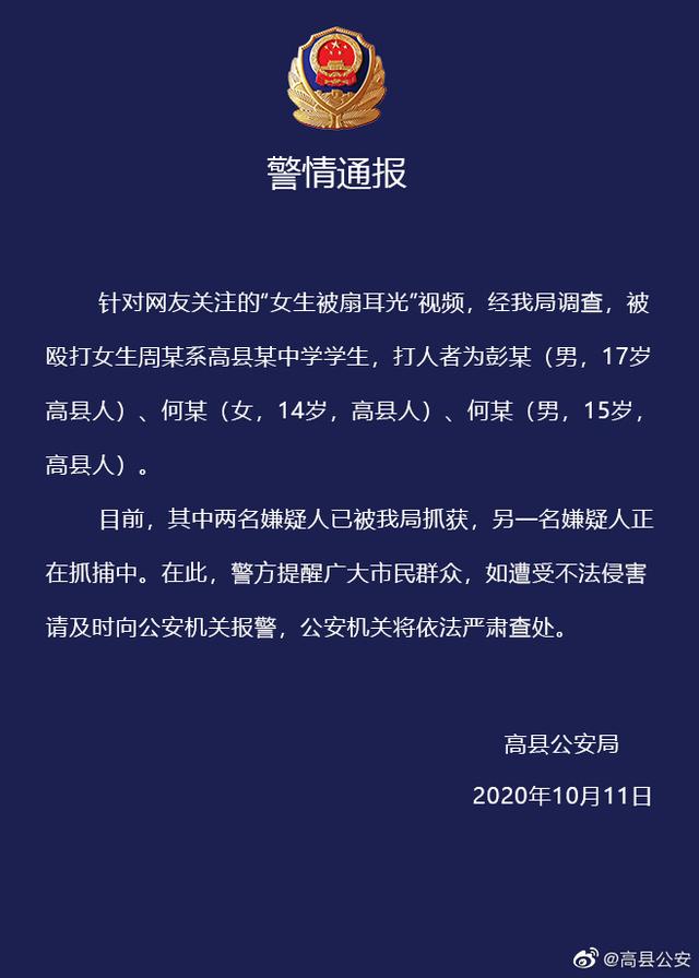 10月11日晚,宜賓市高縣公安局發佈警情通報稱,針對網友關注的「女生被扇耳光」視頻,經該局調查,被毆打女生周某系高縣某中學學生,打人者為彭某(男,17歲高縣人)、何某(女,14歲,高縣人)、何某(男,15歲,高縣人)。目前,其中兩名嫌疑人已被高縣公安局抓獲,另一名嫌疑人正在抓捕中。在此,警方提醒廣大市民群眾,如遭受不法侵害請及時向公安機關報警,公安機關將依法嚴肅查處。
