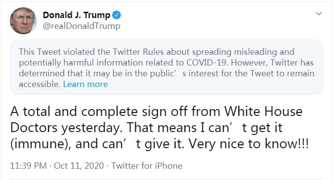 當地時間10月11日,美國總統特朗普在推特發文稱自己已經完全從新冠肺炎中康復並且免疫,不會傳播新冠病毒。然而,這條推文隨後被推特官方標註,稱其傳播與新冠肺炎相關的誤導性和潛在有害信息,但考慮到公眾利益,推特決定允許繼續訪問此推文。