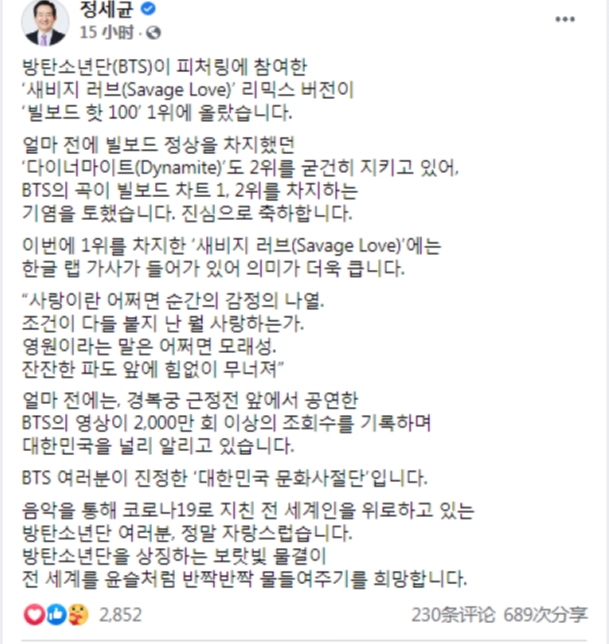 丁世均13日下午在臉書上發文表示,BTS的歌曲佔據了公告牌排行榜的前兩位,氣勢非常火爆。