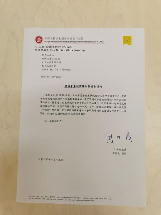 圖為民建聯立法會議員周浩鼎向東涌東薈城發送的信件,要求對方就墮樓意外作適當應對。