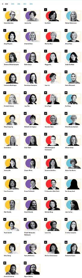 滴滴出行總裁柳青也榜上有名,今年排名第十五位。1月下旬,當新冠病毒在武漢爆發時,中國最大的網約車公司滴滴出行立即採取行動,為武漢的醫務人員組織免費交通。在柳青的領導下,滴滴出行還啟動了一項3000萬美元的基金,為司機提供保護用品和經濟援助。