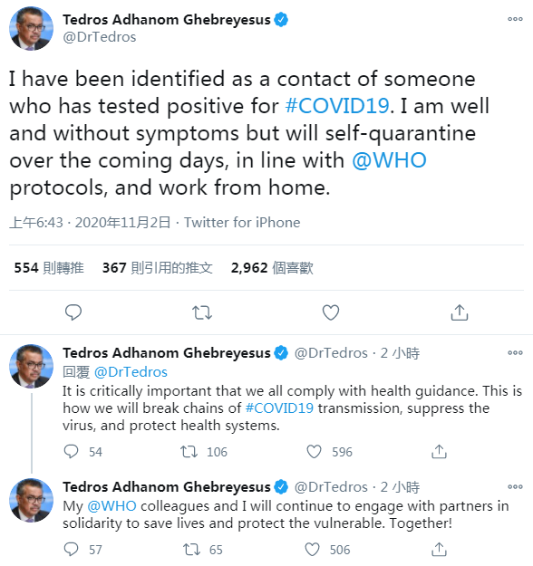 譚德塞在推文中寫道:「我被列為一個新冠檢測呈陽性的人的接觸者。我很好,並且沒有症狀,但在未來幾天會按照世衛組織的方案進行自我隔離,在家中工作。」