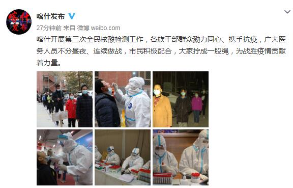據新疆喀什地委對外宣傳辦公室官方微博「喀什發布」消息,喀什開展第三次全民核酸檢測工作,各族幹部群眾勠力同心、攜手抗疫,廣大醫務人員不分晝夜、連續做戰,市民積極配合,大家擰成一股繩,為戰勝疫情貢獻著力量。