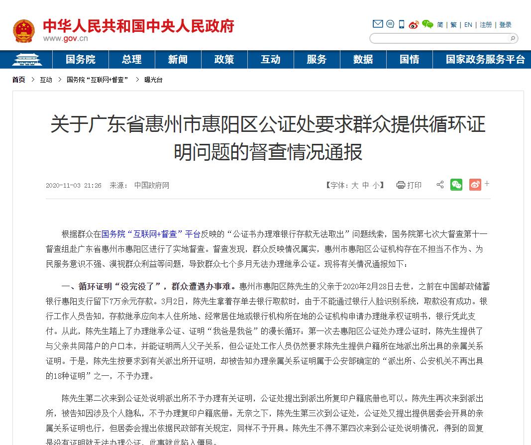 根據群眾在國務院「互聯網+督查」平台反映的「公證書辦理難銀行存款無法取出」問題線索,國務院第七次大督查第十一督查組赴廣東省惠州市惠陽區進行了實地督查。督查發現,群眾反映情況屬實,惠州市惠陽區公證機構存在不擔當不作為、為民服務意識不強、漠視群眾利益等問題,導致群眾七個多月無法辦理繼承公證。現將有關情況通報如下: