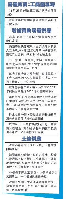 在房屋土地政策方面,今年施政報告提到,從11月26日起撤銷工商舖雙倍從價印花稅(DSD);惟政府「並無計劃」調整住宅物業的各項印花稅安排。有地產代理指,歡迎政府是次減辣措施,此舉絕對有助用家或外來資金入市。