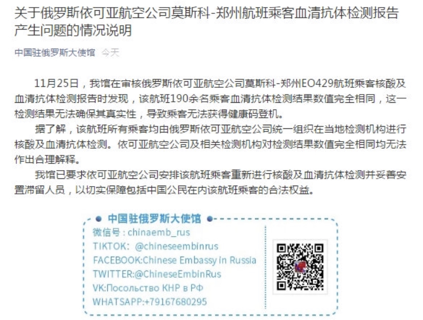 11月25日,中國駐俄羅斯大使館在審核俄羅斯依可亞航空公司莫斯科-鄭州EO429航班乘客核酸及血清抗體檢測報告時發現,該航班190餘名乘客血清抗體檢測結果數值完全相同,這一檢測結果無法確保其真實性,導致乘客無法獲得健康碼登機。