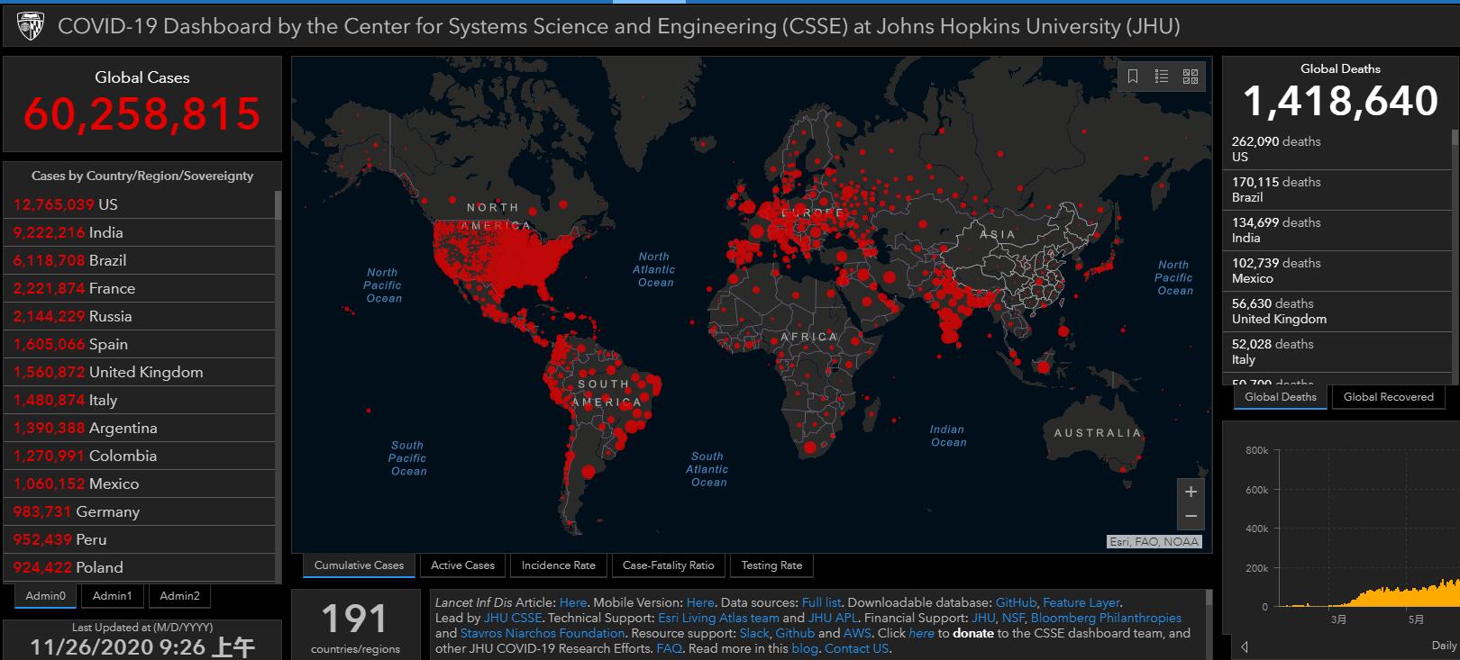 據美國約翰斯•霍普金斯大學公布的實時疫情數據,截至香港時間26日上午9時26分,全球累計新冠病毒確診病例超過6000萬,達60258815例,其中死亡病例達到1418640例。