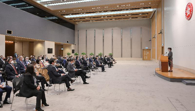 林鄭亦詳細介紹中央政府就7個主要政策方向給予的支持。她歡迎海外商界把握當中良機,尤其是提升香港作為國際金融中心、國際航空樞紐和國際創新科技中心地位的措施所帶來的機遇。她又指,自2020年施政報告宣布香港特別行政區將致力爭取於2050年前實現碳中和後,從海外的經濟貿易辦事處收到外國夥伴非常正面的評價。環境局會爭取時間努力制訂更進取的減碳排放策略和措施,歡迎海外司法管轄區分享經驗。