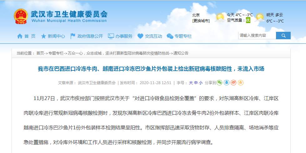 11月27日,湖北省武漢市疾控部門按照武漢市關於「對進口冷鏈食品檢測全覆蓋」的要求,對東湖高新區冷庫、江岸區肉聯冷庫進行常規新冠病毒核酸檢測時,發現東湖高新區冷庫巴西進口冷凍去骨牛肉2份外包裝樣本、江岸區肉聯冷庫越南進口冷凍巴沙魚片1份外包裝樣本檢測結果呈陽性。市區指揮部迅速採取貨物封存、人員排查隔離、場地消殺等應急處置措施,對冷庫外環境和工作人員進行採樣和核酸檢測,並同步開展流行病學調查。