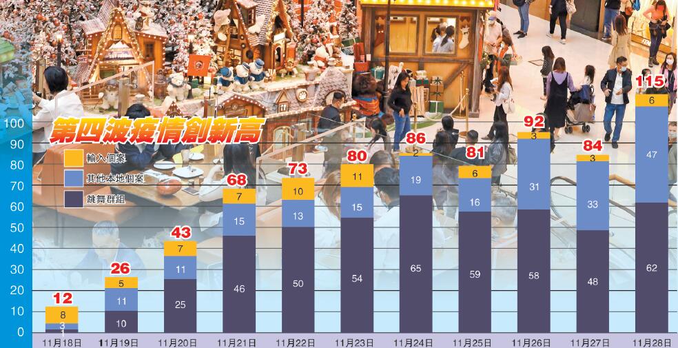 本港新冠肺炎疫情第四波大爆發。衛生防護中心29日公布當日新增115宗確診個案,這是自8月以來確診數首次破百,亦是第四波疫情首次破百。當中,僅6宗為輸入個案;109宗本地個案中,23宗與早前個案相關,跳舞群組再增62宗,至今該群組個案達至479宗,另有24宗源頭不明個案。至此,本港累計確診個案達6238宗。另外,當天尚有50多宗初步確診個案。
